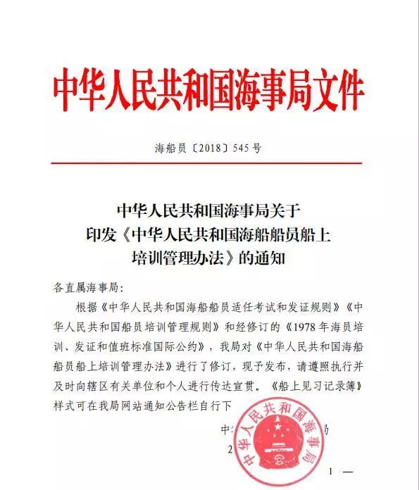 各直屬海事局: 根據(jù)《中華人民共和國(guó)海船船員適任考試和發(fā)證規(guī)則》《中華人民共和國(guó)船員培訓(xùn)管理規(guī)則》和經(jīng)修訂的《1978 年海員培訓(xùn)、發(fā)證和值班標(biāo)準(zhǔn)國(guó)際公約》,我局對(duì)《中華人民共和國(guó)海船船員船上培訓(xùn)管理辦法》進(jìn)行了修訂,現(xiàn)予發(fā)布,請(qǐng)遵照?qǐng)?zhí)行并及時(shí)向轄區(qū)有關(guān)單位和個(gè)人進(jìn)行傳達(dá)宣貫。《船上見(jiàn)習(xí)記錄簿》樣式可在我局網(wǎng)站通知公告欄自行下載。